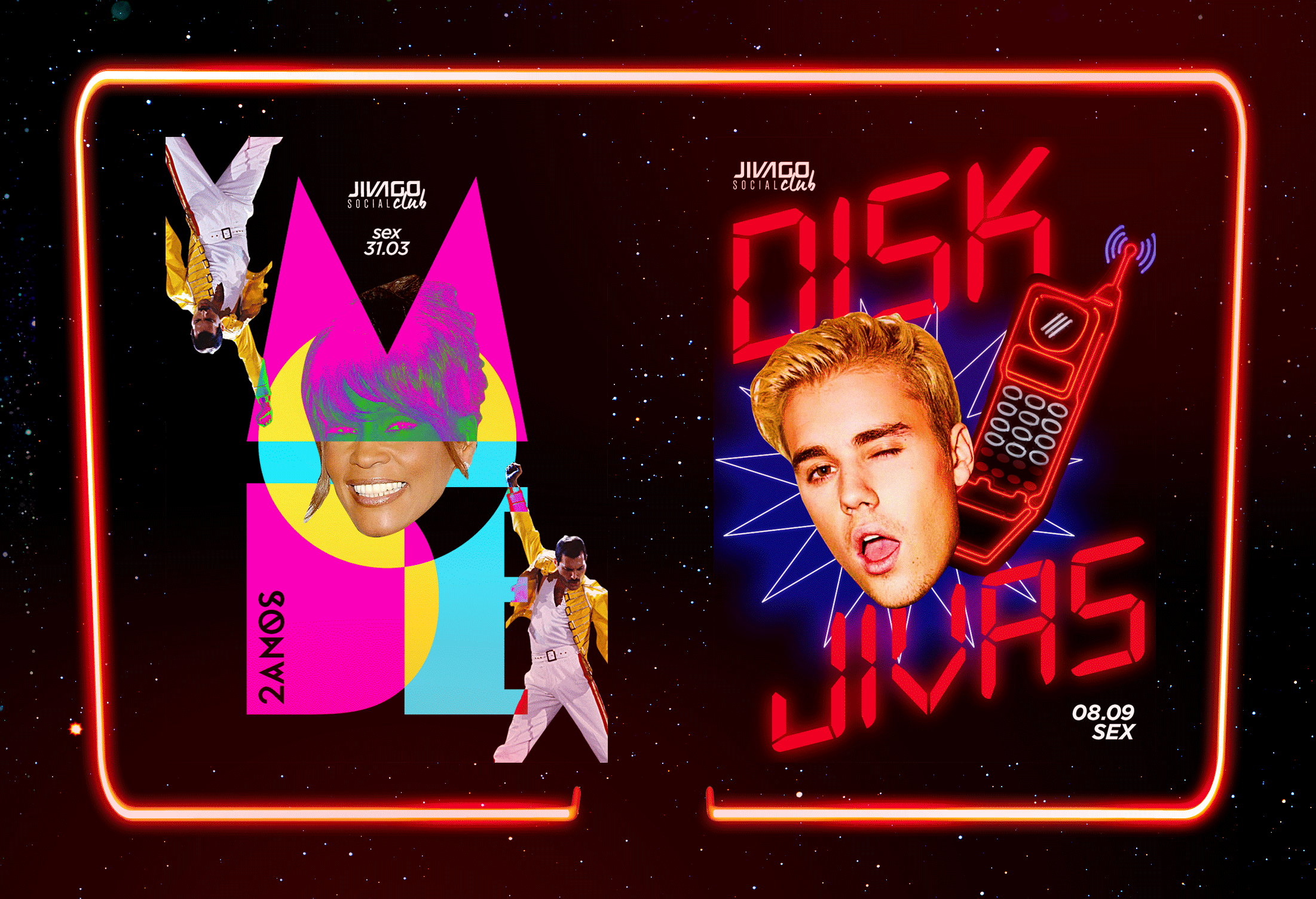 All together and mixed up! After 9 years of history, the club had to reinforce the concept of being a mixed place, where different kinds of people can get together and be who they are. Jivago has a chaotic and vibrant visual that takes the frequent clubbers to different ambiances, where they can experience distinct visual and tactile sensations.